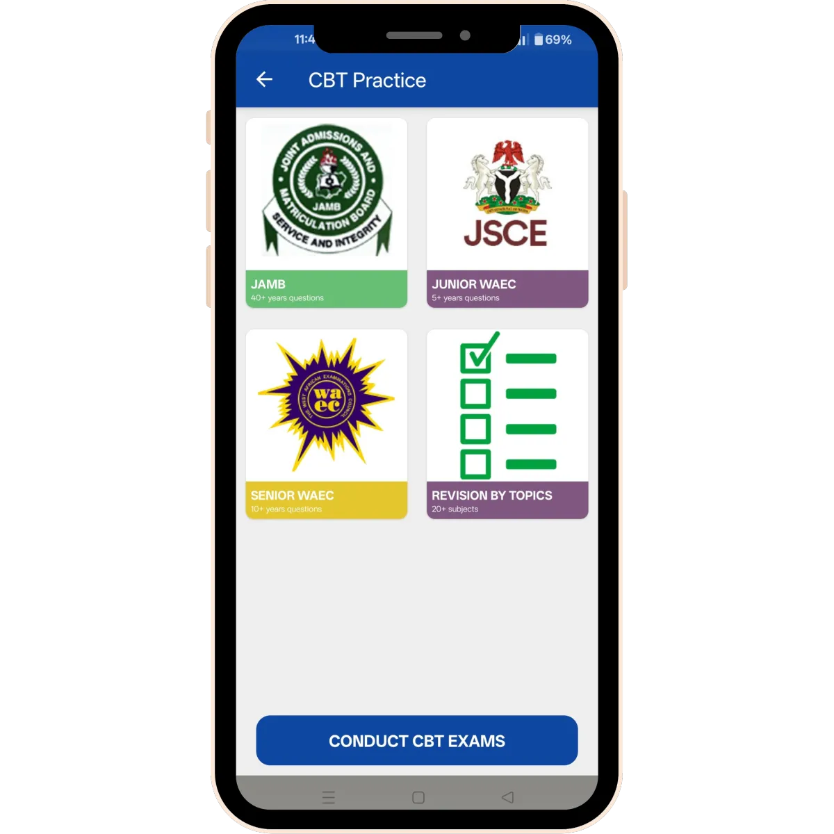 Full CBT Exam System: Run your internal exams as CBT — no marking stress, no errors, instant results. This gets your students fully comfortable with CBT while also giving them access to WAEC, NECO, BECE, and JAMB past questions for practice — online or offline.