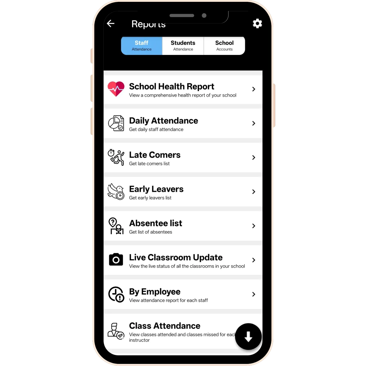 The teachers are also trained to use their phone to scan each student's I.D card. By doing this, you get instant reports and analysis of the daily attendance of your students. Parents are also notified when their kids arrive or leave the school